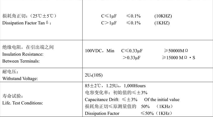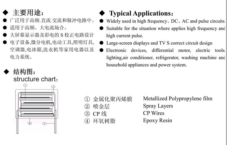 特點:體積小,有良好自愈性,高頻損耗小,溫升低。高沖擊強度。高頻交流條件下有良好的耐壓性能。