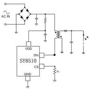 SY8510是一款專(zhuān)用于LED恒流驅(qū)動(dòng)的控制芯片,通過(guò)采用專(zhuān)有的初級(jí)側(cè)LED恒流控制技術(shù),使得系統(tǒng)架構(gòu)得到了最大程度的精簡(jiǎn)。它不但省去了傳統(tǒng)二次側(cè)控制所需的光耦和431等反饋器件,而且還進(jìn)一步省去傳統(tǒng)初級(jí)側(cè)控制架構(gòu)中用于實(shí)現(xiàn)反饋的輔助繞組,反饋電阻以及為IC供電的整流二極管等無(wú)源器件,使系統(tǒng)成本得到極大程度的降低。由于采用高壓直接供電,SY8510系統(tǒng)的輸出電壓范圍得到極大的拓寬,同一驅(qū)動(dòng)系統(tǒng)可以驅(qū)動(dòng)1~3顆串聯(lián)LED,方便系列機(jī)種應(yīng)用。右圖示出了這種芯片的典型應(yīng)用。SY8510還集成了完善的保護(hù)功能,包括輸入電流的逐周期過(guò)流保護(hù),電流檢測(cè)管腳的開(kāi)路保護(hù),IC過(guò)溫保護(hù),以及輸出端的開(kāi)路和短路保護(hù)等。