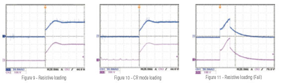 圖9是以真實電阻為負載的拉載電流波形(藍色);圖10為定電阻模式仿真真實電阻的拉載電流波形(藍色);圖9與圖10的電流與LED為負載的電流波形有相當大差異,且電流及電壓都有過沖的情況發生,易導致LED driver在開機時發生過電壓或過電流保護,如圖11所示。因此不管是真實電阻或是電子負載的定電阻模式,都比較無法仿真真實的情況。