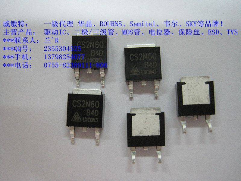 General Description: CS2N60B4D, the silicon N-channel Enhanced VDMOSFETs, is obtained by the self-aligned planar Technology which reduce the conduction loss, improve switching performance and enhance the avalanche energy. The transistor can be used in various power switching circuit for system miniaturization and higher efficiency. The package form is TO-252, which accords with the RoHS standard. Features: Fast Switching ESD Improved Capability Low Gate Charge (Typical Data:7.5nC) Low Reverse transfer capacitances(Typical:5.0pF) 100% Single Pulse avalanche energy Test 以下是我司一級(jí)代理的產(chǎn)品線和主要產(chǎn)品: 一,高壓大電流MOS管系列: 1N60/2N60/4N60/5N60/7N60/8N60/10N60/12N60/4N65/5N65/7N65/8N65/10N65/12N65 產(chǎn)品應(yīng)用:1.LED電源/2.電源(開關(guān)電源、UPS電源、通信電等)/3.充電器/4.適配器/5.電源板/6.小家電、家電電源板/7.電動(dòng)工具/8.電腦主板、顯卡 二,恒流二極管: 2H 產(chǎn)品應(yīng)用:1.LED日光燈 2.LED球泡燈 3.恒流源等 三,LED驅(qū)動(dòng)IC系列: CS8211AEO、 CS7208S/10S/20D、CS9208S/10S/20D/40D、CS6552EP、CS6552FEP 產(chǎn)品應(yīng)用:日光管,天花燈,吸頂,面板,筒燈,射燈,格柵燈等 四,三極管: 13001P/ 產(chǎn)品應(yīng)用:1.緊湊型電子節(jié)能燈 2. 電子鎮(zhèn)流器 3. 一般功率開關(guān)電路等 五,橋堆: R6S08 產(chǎn)品應(yīng)用:1. LED整流電路 2.節(jié)能燈 3.中小功率電源等