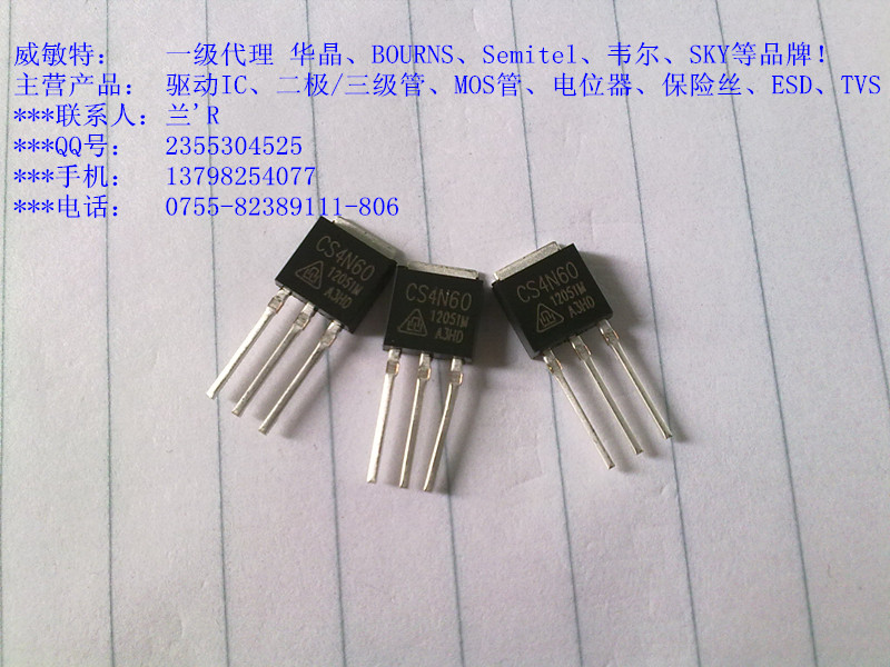 General Description: CS4N VDMOSFETs, is obtained by the self-aligned planar Technology which reduce the conduction loss, improve switching performance and enhance the avalanche energy. The transistor can be used in various power switching circuit for system miniaturization and higher efficiency. The package form is TO-251, which accords with the RoHS standard. Features: z Fast Switching z ESD Improved Capability z Low Gate Charge (Typical Data: 13nC) z Low Reverse transfer capacitances(Typical: 4.2pF) z 100% Single Pulse avalanche energy Test 以下是我司一級代理的產品線和主要產品: 一,高壓大電流MOS管系列: 1N60/2N60/4N60/5N60/7N60/8N60/10N60/12N60/4N65/5N65/7N65/8N65/10N65/12N65 產品應用:1.LED電源/2.電源(開關電源、UPS電源、通信電等)/3.充電器/4.適配器/5.電源板/6.小家電、家電電源板/7.電動工具/8.電腦主板、顯卡 二,恒流二極管: 2H 產品應用:1.LED日光燈 2.LED球泡燈 3.恒流源等 三,LED驅動IC系列: CS8211AEO、 CS7208S/10S/20D、CS9208S/10S/20D/40D、CS6552EP、CS6552FEP 產品應用:日光管,天花燈,吸頂,面板,筒燈,射燈,格柵燈等 四,三極管: 13001P/ 產品應用:1.緊湊型電子節能燈 2. 電子鎮流器 3. 一般功率開關電路等 五,橋堆: R6S08 產品應用:1. LED整流電路 2.節能燈 3.中小功率電源等 恭候您的來電咨詢及訂購,本公司可以提供方案上全套元器件!