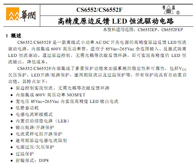 CS6515 是一款離線式小功率 AC/DC 開關電源的高精度原邊反饋 LED 恒流驅動電