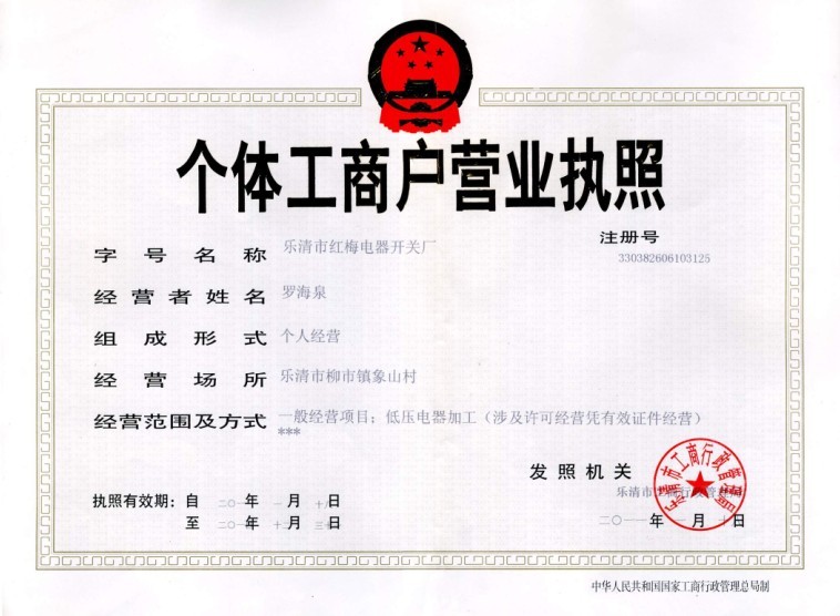樂清市紅梅電器開關(guān)廠營業(yè)許可證