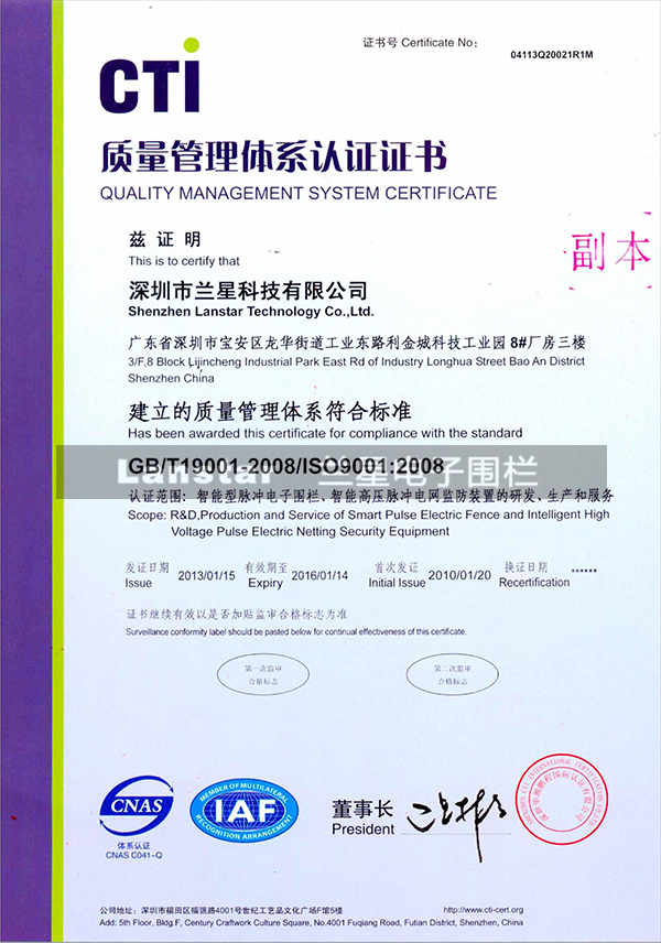 ISO9001質量體系認證證書