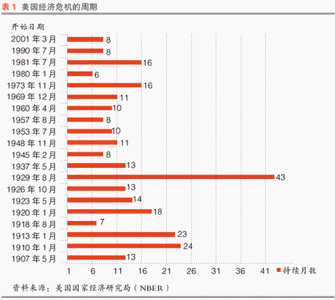 此次由美國次貸危機引發的金融危機將會持續多久呢?美國的救市行動能否或者何時能夠取得成效?回顧一百年來的各次經濟衰退,可以發現經濟衰退的周期長短不盡相同。根據美國國家經濟研究局(NBER)的統計,自上世紀初以來,美國經濟衰退始于經濟發展的高峰而終于低谷,最長的持續43個月,而最短的也有6個月。第二次世界大戰之后的經濟衰退平均持續10個月(見表1)。現在雖然不能斷定世界經濟已經進入了衰退期,但是經濟發展的放緩是沒有太多爭議的了。