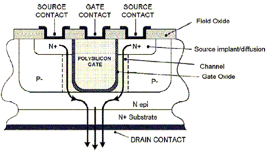 在它上面要生長了一層n-epi,并制成了兩個連續的擴散區,p區中合適的偏置將產生溝道,而在它里面擴散出的n+區定義了源極。下一步,在形成磷摻雜多晶硅之后,要生長薄的高品質柵極氧化層,從而形成柵極。要在定義源極和柵電極的頂層上開接觸窗口,與此同時,整個晶圓的底層使漏極接觸。由于在柵極上沒有偏置,n+源和n漏被p區分隔,并且沒有電流流過(三極管被關閉)。