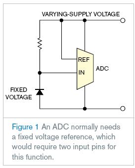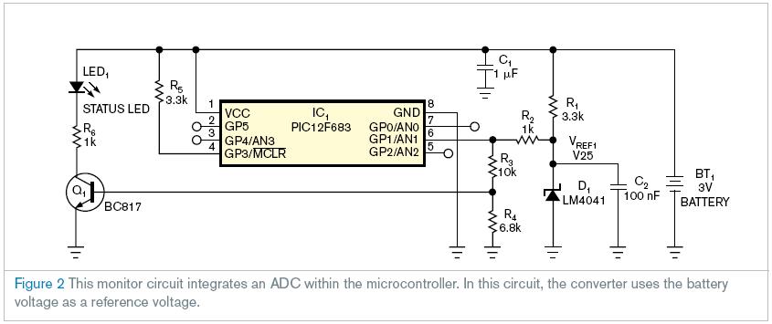有些微控制器允許在一個低于3v的供給電壓下進行操作。這項功能允許直接從沒有電壓降和漏電流的3v堿性或者鋰性電池上加電。這個監控電池電壓是十分重要的,來確保系統的完整性。在這個設計理念下的電路通過調節推進功率轉換器的占空系數來給白色LED背光持續加電。然而,一個ADC通常需要一個固定的基準電壓(圖一),ADC的這個功能需要2個輸入引腳。這個設計理念徹底的顛倒了ADC的建筑結構,不用外部引腳就可以提供基準電壓的功能。