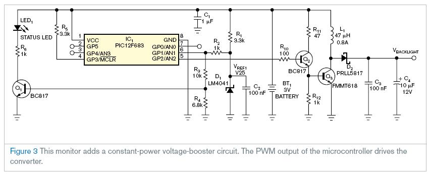 圖三展示了擁有一個額外的穩頻升壓電路的監控器。這個微控制器的PWM輸出端驅動轉換器。為了從升壓器得到恒定的功率,需要的占空系數線性的與ADC的轉換值有關系。