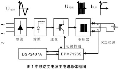 中頻逆變直流電阻焊機的供電電源是由三相工頻交流電源經(jīng)整流電路和濾波電容轉(zhuǎn)換成直流電源,再經(jīng)由功率開關(guān)器件組成的逆變電路轉(zhuǎn)換成中頻方波電源,然后輸入變壓器降壓后,經(jīng)低管壓降的大功率二極管整流成直流電源,供給焊機的電極,對工件進行焊接(見圖1)?刂齐娐凡糠钟蒁SP和CPLD組成,DSP(TMS320LF2407A)產(chǎn)生的PWM波和檢測信號、保護信號在CPLD(EPM7128S)里現(xiàn)實邏輯運算。
