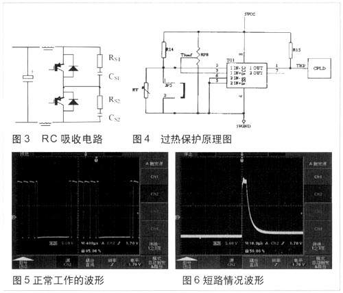 本文采用普通散熱器與強迫風冷相結(jié)合的措施,并在控制電路上加過熱檢測保護電路,應付IGBT與散熱器接觸不良或者非正常情況,在IGBT散熱片上安裝熱敏電阻,然后通過邏輯判斷電路給出信號,供控制電路處理(見圖4)。