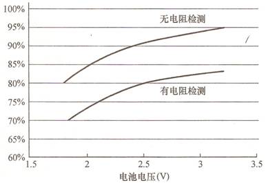 圖2示出了在350mA電流調整點時的負載電流調節與升壓電壓的效率曲線。在正常的電池電壓范圍內,工作效率可達到80%以上,但是隨著電池電壓降低到壽命終點值,效率會降低。另外,圖2還說明了有無檢測電阻的影響。在輸入電壓較高時,效率接近95%,而在輸入電壓較低時,效率將降到80%。曲線的趨勢源自兩個相關的效應:一是在高輸入電壓下,輸入電流和開關電流較低,因此傳導和開關損耗較低;二是與自耦變壓器極其類似,升壓功率級不處理總輸入功率。功率級處理的功率量與升壓電壓相關,或者與輸入電壓和白光LED電壓之間的壓差相關。在此設計中,白光LED的電壓大約為8.7V,因此,在8.2V的高壓線路上,功率級只處理功率的6%[(8.7-8.2)/8.7]。在電流高得多的低壓線路上,功率級要處理8.2V時的4倍功率,即24%的功率。