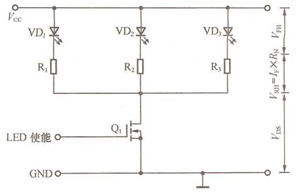 白光LED為電流驅動器件,光輸出強度由流過LED的電流決定。圖3所示的是由電壓源和限流電阻構成的一種簡單偏置電路,流過白光LED的電流由下式確定:IDIODE=(VCC-VF)/(RLIM+RDS(ON))           (1)