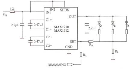 (2)用電荷泵升壓變換器驅動白光LED的方案