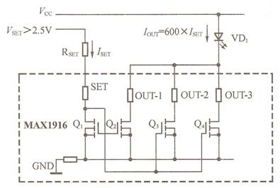 MAX1916為專用白光LED驅動集成電路,它提供了一種先進的白光LED電流偏置電路。MAX1916在微型SOT-23封裝內集成了三組電流源,流過RSET的電流鏡像到三個輸出端,如圖8所示。電路中幾個相同的MOSFET管具有相同的柵源電源,因此,它們的溝道電流相同,電流的大小由鏡像電流ISET決定。MAX1916的最大電流失配度為±5%,“鏡像系數”為200A/A。也就是說,當ISET為50μA時,每個輸出端的電流為10×(1±0.05)mA(最大值)。SET端由內部偏置在1.25V。ISET由下式決定: