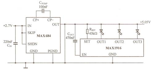 正向電壓為8.5~4.2V(在20mA電流下)的白光LED通常需要升壓變換器,可以用電荷泵(如MAX682~MAX684)與MAX1916共同構成這種白光LED的驅動電路,如圖10所示。MAX682~MAX684能夠將2.7V的輸入電壓轉換為5.05V輸出,輸出電流能夠分別達到 250mA、100mA和50mA。利用MAX684的關斷控制引腳或MAX1916的使能控制引腳可以關閉白光LED。在圖10所示電路中, MAX684在關斷模式下,電源電流降至22μA;RSET=43kΩ時,白光LED的電流為22mA。