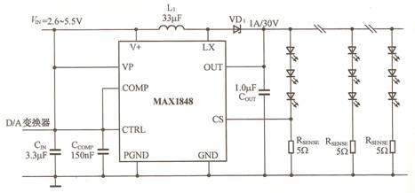 白光LED的亮度可以通過MAX1848的CTRL引腳的D/A變換器調節或電位器分壓電路調節,電壓控制范圍為+250mV~+5.5V,將控制引腳接地可實現關斷。負載功率為800mW時,電路轉換效率達88%。