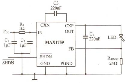 圖11所示的是利用電荷泵構成的白光LED電流控制電路,反饋調節電壓的典型值為1.235V, Ipk=1.235/RSENSE,選用24Ω的檢流電阻能夠為白光LED提供50mA電流。當電荷泵工作時,輸出電壓上升至白光LED的開啟電壓,白光LED開始導通。白光LED的典型正向電壓為8.5×(1±0.1)V,加上反饋調節電壓,MAX1759的輸出端提供的偏置電壓為4.735V。該電路輸出電壓的紋波在40mV以內,不會導致白光LED的輸出產生明顯變化,通常人眼覺察不到。另外,圖11所示電路在關斷狀態下時輸入與輸出之間沒直流通路。