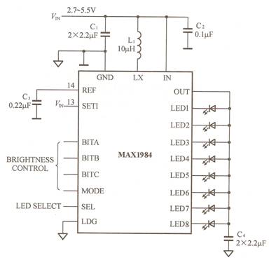 MAX1984的典型應用電路如圖13所示,這是一個驅動8只白光LED的電路。有關能數的計算及組件的選擇如