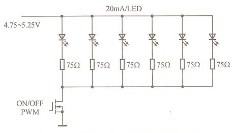 選用白光LED最明顯的問題是產品的匹配性差。按照白光LED的典型規格,電流20mA時正向電壓的最小值為3.0V,典型值為3.5V,最大值為 4.0V。顯然,穩壓源不是合理的解決方案。利用相同的電流驅動每只LED可以獲得均勻亮度,但成本很高。在許多應用中只是簡單地用一個固定偏置電壓和限流電阻驅動白光LED,如圖14所示。