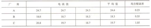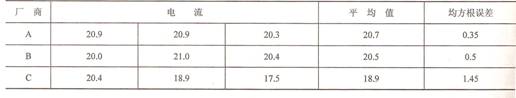 從表1中的平均值可以看出,不同廠商提供的白光LED的一致性較差,其中A廠商提供的白光LED的吸取電流最大(平均24.6mA),B廠商提供的白光 LED的吸取電流最。ㄆ骄鶠18.3mA)。不同廠商的白光LED的電流在采用相同的偏置電壓、相同的限流電阻時差別較大,均方根誤差為3.27mA。