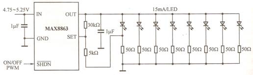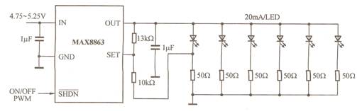 圖16所示電路是對圖15所示電路的改進,適合便攜式產品的背光光源要求。MAX8863可以驅動8只白光LED,每只白光LED的電流為15mA。當白光LED的正向電壓較低或限流電阻的電流低于15mA時,所允許的輸入電壓更低,對不同廠商、不同批次的白光LED可提供較好的亮度匹配。