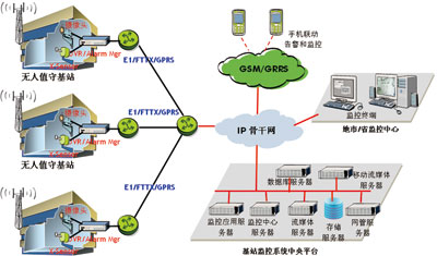 上海貝爾阿爾卡特ESS(EnhancedStationSurveillance)增強型基站及機房監控系統將動力環境監控和圖像視頻監控整合于一體,針對不同基站及機房的監控需求,提供全面的解決方案(如圖所示)。