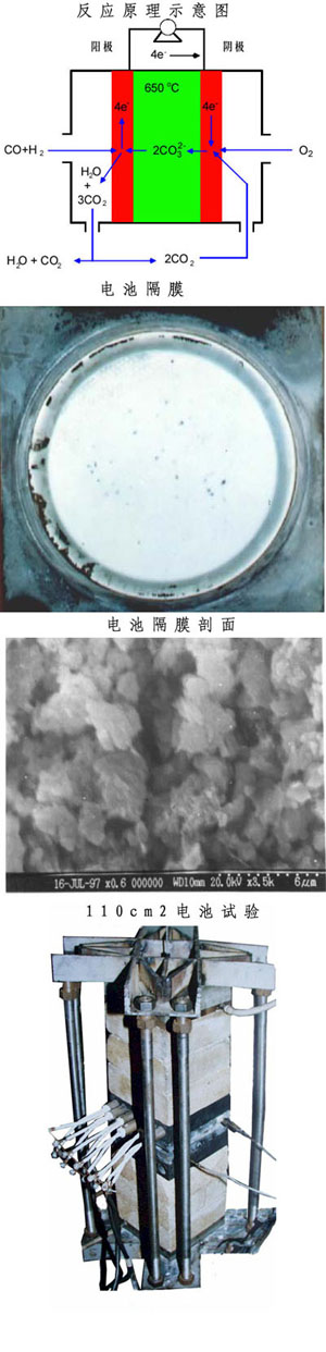 燃料電池工程中心研制和小批量生產隔膜材料和電池隔膜,制備MCFC電極并組裝數千瓦的電池組。已可批量生產隔膜材料LiAlO2粉料,開發成功制備1000cm2 LiAlO2隔膜的工藝,已組裝了28cm2、110cm2單電池,并進行了電池性能的評價和研究,現正在進行千瓦級電池組的研制。