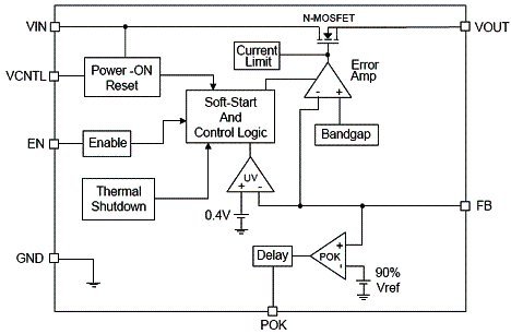 AX6610-6615系列ULDO產品設計皆采用雙電源之架構來設計,電源VIN為輸出轉換的來源,電源VCNTL為內部電路所用電源。再搭配使用N-MOSFET作為驅動器。AX6610-6615的參考電位設計在0.8伏特,因此最低的可輸出電壓可達0.8伏特。其輸出電壓軟啟動時間僅有1毫秒,可大幅降低開機時的電流浪涌。輸入電壓VIN、VCNTL皆具有過低電壓監測功能,當輸入電壓過低時會停止輸出,可避免本身IC端與后方系統端的功能誤動作。此外,為了確保后端系統所得到的電壓正確無誤,本產品具有Power-OK引腳,用以提供后端系統告警之用。本身IC內部具備一90歐的放電電阻,在輸出關閉時會啟用,具有自我快速放電功能。過電流保護電路,會在電流超過安全范圍時予以限制。若當輸出處于短路狀態時,還將啟動輸出周期性開啟機制,不讓輸出電流持續處于高壓差且限制電流值的狀態(因為此時之發熱功率為最大)直到短路狀態被解除。在持續重載或大跨壓下,熱量會持續累積,溫度會上升,當到達最高溫度容許值時,會啟動過溫保護功能,此時會關閉輸出,以避免IC燒毀,直到溫度恢復到回復點,此時輸出將會被重啟。此外在線性穩定度、負載穩定度與電源抑制比等指標上(PSRR),AX6610-6615亦有相當優異的表現。