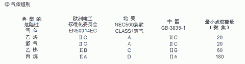 氣體分組和點(diǎn)燃溫度,在一定環(huán)境溫度和壓力下與可燃性氣體和空氣的混合濃度有關(guān)。