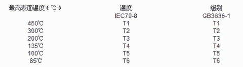 這是與氣體點(diǎn)燃溫度有關(guān)的電氣設(shè)備(假定環(huán)境溫度為40℃時(shí))的最高表面溫度,點(diǎn)燃能量與點(diǎn)燃溫度無(wú)關(guān)。在標(biāo)準(zhǔn)BS5345第一部分中列出了所有可燃性氣體和其組別。