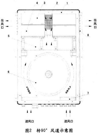 1)由風(fēng)機(jī)7、散熱器2、風(fēng)道板3/4、百葉窗8形成轉(zhuǎn)90°風(fēng)道。