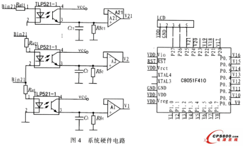 測量單體電池電壓的方法有多種,最簡單的是用電阻分壓方式測量:依次測量各串聯節點的電壓,由于所測電壓是總電壓,單體電池電壓只占一部分,則測量精度按比例降低;另一種測量方法是每一個單體電池采用一個隔離運算放大器,這種運算放大器可把電池電壓轉換為統一參考地電壓,而且避免了由電阻分壓造成的漂移誤差和漏電流等問題,但是體積大且價格高,僅適合于那些測量精度要求高且不考慮漏電流和成本的場合。另外,第三種方法是采用繼電器陣列選擇進行測量,該方法控制開關復雜。而目前電壓測量應用較多的是運算放大器差分放大法及直接采樣法,但這些方法都存在電路復雜,體積大的缺點,運用于那些對體積和重量有要求的領域則有一定的局限性。因此,這里提出一種采用普通光耦代替線性光耦的測量方法,以C8051F410嵌入式單片機為核心的便攜式串聯電池組電壓檢測系統。