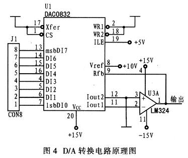為實現(xiàn)電壓值的D/A模轉(zhuǎn)換,在電路中還要專門設計D/A轉(zhuǎn)換電路,如圖4所示。為降低設計成本,采用8位DAC0832轉(zhuǎn)換器。DAC0832屬于倒T 型電阻網(wǎng)絡型D/A轉(zhuǎn)換器,內(nèi)部無運算放大器,輸出為電流形式,因此,使用時,需外接一個運算放大器。DAC0832可根據(jù)實際情況接成雙緩沖、單緩沖和直緩沖3種形式,此D/A轉(zhuǎn)換器接成第3種形式使用,即引腳1、2、17、18接低電平,19引腳接+5 V。引腳8為參考電壓輸入端口,接+10 V電源,當數(shù)字輸入端全為高電平時,模擬輸出端為-1O V。