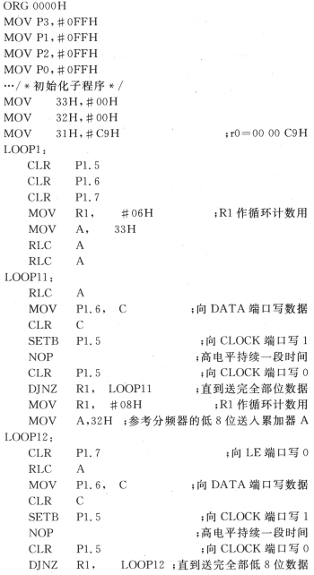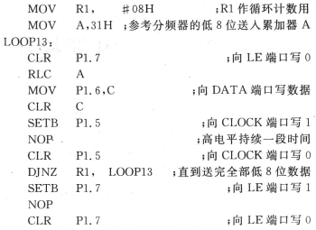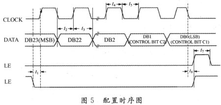 單片機P1.5,P1.6,P1.7三個I/O口分別與芯片CLK,DATA,LE相連。圖5給出了數(shù)據(jù)輸入的時序圖。數(shù)據(jù)(DATA)在每個時鐘(CLOCK)的上升沿從MSB(最高有效位)開始依次寫入24位移位寄存器中,直到LSB位寫入完成之后,由來自LE的上升沿將存儲在24位移位寄存器中的數(shù)據(jù)一次性鎖存入目標寄存器(包括R計數(shù)鎖存器、N計數(shù)鎖存器、功能鎖存器以及初始化鎖存器),再進行下一個目標寄存器的初始化。寄存器賦值順序為R-C-N,目標寄存器的選擇由移位寄存器最末兩位DB0,DB1來決定,其中C和N寄存器的賦值時間間隔應大于5 ms。