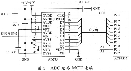 選擇使用AD775作為本方案中的A/D變換器。AD775是一款CMOS、低功耗、8位、20 MSPS采樣模數轉換器(ADC),內置采樣功能和片內基準電壓偏置電阻,可提供完整8位ADC解決方案。它采用流水線式或乒乓兩步式FLASH架構,可提供最高35 MHz的采樣速率,同時保持極低的功耗(60 mW)。該器件融合了出色的微分非線性(DNL)、高采樣速率、低差分增益與相位誤差、極低功耗以及+5 V單電源工作等特性,其參考電阻可采用多種配置方式進行連接,以處理不同的輸入范圍。與傳統的FLASH型轉換器相比,低輸入電容提供易于驅動的輸入負載。圖3給出ADC的外圍電路以及和MCU數據傳輸的連接關系。