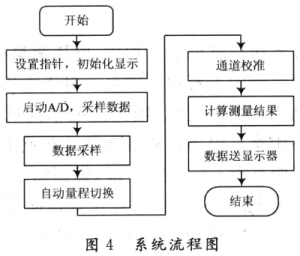 軟件設計采用模塊化設計思想,每個模塊實現特定的功能。系統軟件包括主程序、定時中斷程序和一系列功能子程序。上電后程序初始化,進入監控狀態,顯示待機界面等待測量。測量時啟動A/D后,首先選擇最大量程對外部數據進行采樣計算并判斷,確定合適的量程。切換量程后再次采樣,記錄得到的數據,通過相應對相應量程的計算,得到測量的電壓。如果需要,MCU可與微型打印機通過并口連接,將存儲于RAM中的電壓歷史數據和當前數據打印出來,作為資料存檔保留,系統流程圖如圖4所示。