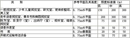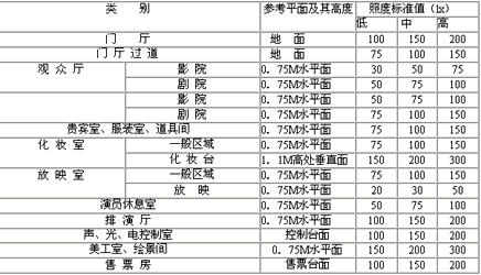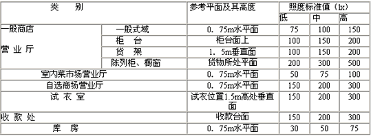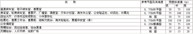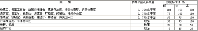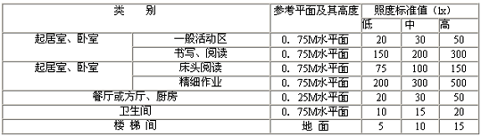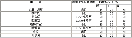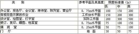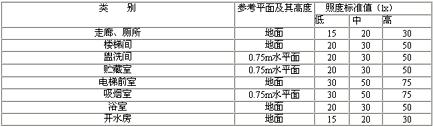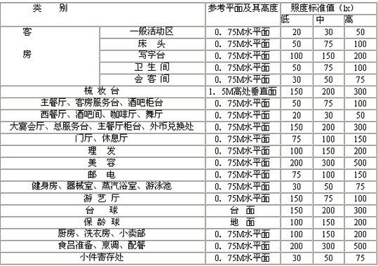注:1.客房無臺燈等局部照明時,一般活動區的照明可提高一級;