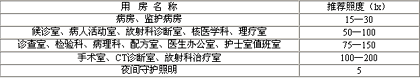表3-3-13為綜合醫院建筑照度推薦值。表3-3-14為道路照明推薦照度值。表3-3-15為建筑物立面照明照度推薦值。