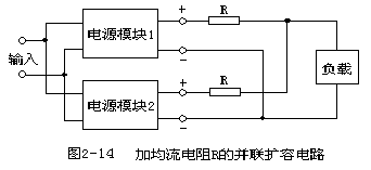 電源并聯運行比串聯運行更困難,一般不允許電源并聯,除非特殊設計允許并聯或者技術條件注明可以并聯運行。并聯運行中,兩臺電源要想提供同樣的輸出電流幾乎不可能實現。兩臺固定輸出電壓的電源,盡管型號一樣,也不可能有恰好相等的輸出電壓,輸出電壓較大者將企圖提供整個負載電流。即使輸出電壓可以調整到完全相等,各電源輸出阻抗、溫漂、時漂的差別將使兩臺電源的負載不平衡。圖2-14給出一種電阻均流的并聯方式。這種方法很難得到一個好的結果。因為輸出端間微小的電壓差將引起很大的電流失衡量。假定輸出電壓標稱值為5V,所帶負載電流為2A。當輸出電壓相差0.2V,就引起輸出電流的100%差值,這就意味著一個輸出端提供全部負載電流。當輸出電壓為50mV時也會導致輸出電流25%失衡。然而,上述并聯在少數應用中是可以利用的,但要注意幾件事: