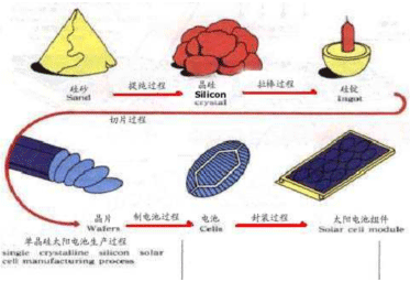 "硅"是我們這個星球上儲藏最豐富的材料之一。自從上個世紀科學家們發現了晶體硅的半導體特性后,它幾乎改變了一切,甚至人類的思維,20世紀末,我們的生活中處處可見"硅"的身影和作用,晶體硅太陽電池是近15年來形成產業化最快的。生產過程大致可分為五個步驟:a)提純過程 b)拉棒過程 c)切片過程 d)制電池過程 e)封裝過程. 如下圖所示: