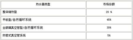 目前在市場上占主導地位的熱水器主要有平板型和真空管型兩種。平板型熱水器國內市場份額約65%,;真空管熱水器分全玻璃和熱管式兩種,國內市場份額約35%,不同熱水器的市場份額見表3-4,目前熱水器主要用于家庭,其次是廠礦機關公共場所等。