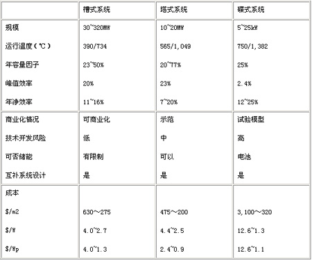 三種系統目前只有槽式線聚焦系統實現了商業化,其他兩種處在示范階段,有實現商業化的可能和前景。三種系統均可用單獨使用太陽能運行,也可安裝成燃料混合系統,其性能比較如表3-5所示。