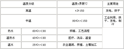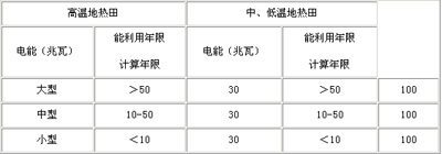 根據地熱勘查國家標準GB11615─89規定,地熱資源按溫度分為高溫、中溫、低溫三級,按地熱田規模分為大、中、小三類(見表4-2、4-3)。
