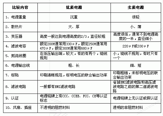 優劣質電源在外觀、做工上存在很大區別,下表是可以比較的區別。由于消費者一般不能打開電源,因此主要的鑒別方法只能限于看外觀、掂重量、看標貼,以及透過散熱孔看變壓器的高度等簡單的辦法。