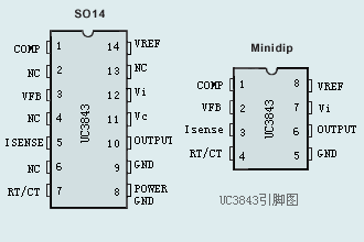 UC3843有4種封裝形式,一種是14pin雙列直插和SOP-14,另一種是8pin雙列直插和SOP-8。我們以最簡(jiǎn)的8pin封裝簡(jiǎn)述其工作原理。[IMG]20072289575883293.gif[/IMG] pin(1)是補(bǔ)償端,外接電阻電容元件以補(bǔ)償誤差放大器的頻率特性。第(2)腳是反饋端,將取樣電壓加至誤差放大器的反相輸入端,再與同相輸入端的基準(zhǔn)電壓進(jìn)行比較,輸出誤差控制電壓。第(3)腳接過(guò)流檢測(cè)電阻,組成過(guò)流保護(hù)電路。RT/RC為鋸齒波振蕩器的定時(shí)電阻和電容的公共端,內(nèi)部基準(zhǔn)電壓為VREF=5V。輸入電壓Vi≤30V,輸出端電壓Vo取決于高頻變壓器的變壓比。