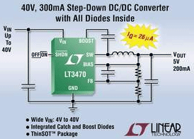 凌特公司(Linear Technology)近日推出一款在ThinSOT封裝中集成了升壓與箝位二極管的40V微功率降壓型DC/DC轉換器——LT3470。該器件的輸入電壓范圍為4V至40V,可提供高達200mA的輸出電流,特別適用于2節鋰電池、交流適配器或汽車電源應用。