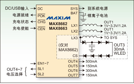 圖:Maxim的 MAX8662/3部件在一塊單芯片上集成了1個(gè)USB/AC 充電器、2個(gè)步降DC/DC 轉(zhuǎn)換器,4個(gè)LDO和1個(gè)步升DC/DC 轉(zhuǎn)換器,是便攜式系統(tǒng)功率集成的典型范例。