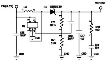 U3內部的充電泵電路主要通過外接C20電容實現低輸入電壓的提升,滿足內部部分電路高電壓的要求。在3.3V輸入的條件下,需要C20啟動內部充電泵;在5V輸入條件下,C20泵電容可以不接。