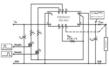 PTH03030模塊的微調模塊外部應用電路如圖7所示。模塊的微調輸出電壓正/負偏輸出的控制腳分別是9和10腳,正偏微調電阻Ru通過場效應管Q2接地,負偏微調電阻Rd通過場效應管Q1接地。當需要輸出進入正偏模式時,只要在Q2的柵極施加高電平,使Q2導通,Ru回路導通,通過內部的微調電壓分壓,可實現輸出電壓的正偏移輸出,負偏電壓微調輸出同理。