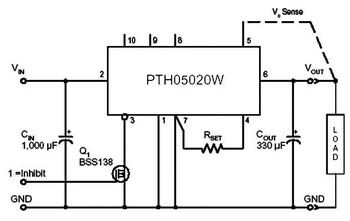 PTH03030H的ON/OFF開關由INHIBIT使能管腳控制,可實現全局模塊的關斷或者輸出。INHIBIT管腳不是TTL接口的電平,在設計階段注意不能直接和3.3V邏輯器件的I/O直接連接,推薦接法如圖9所示。